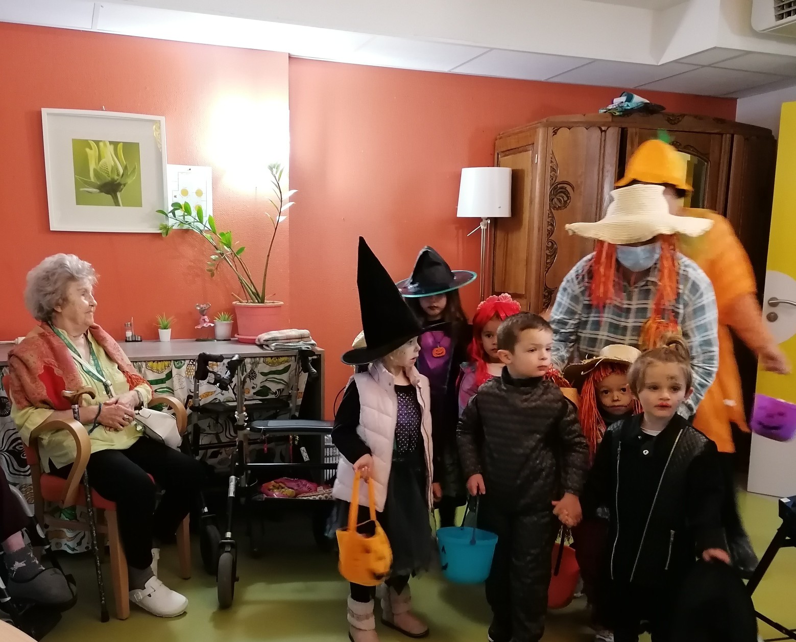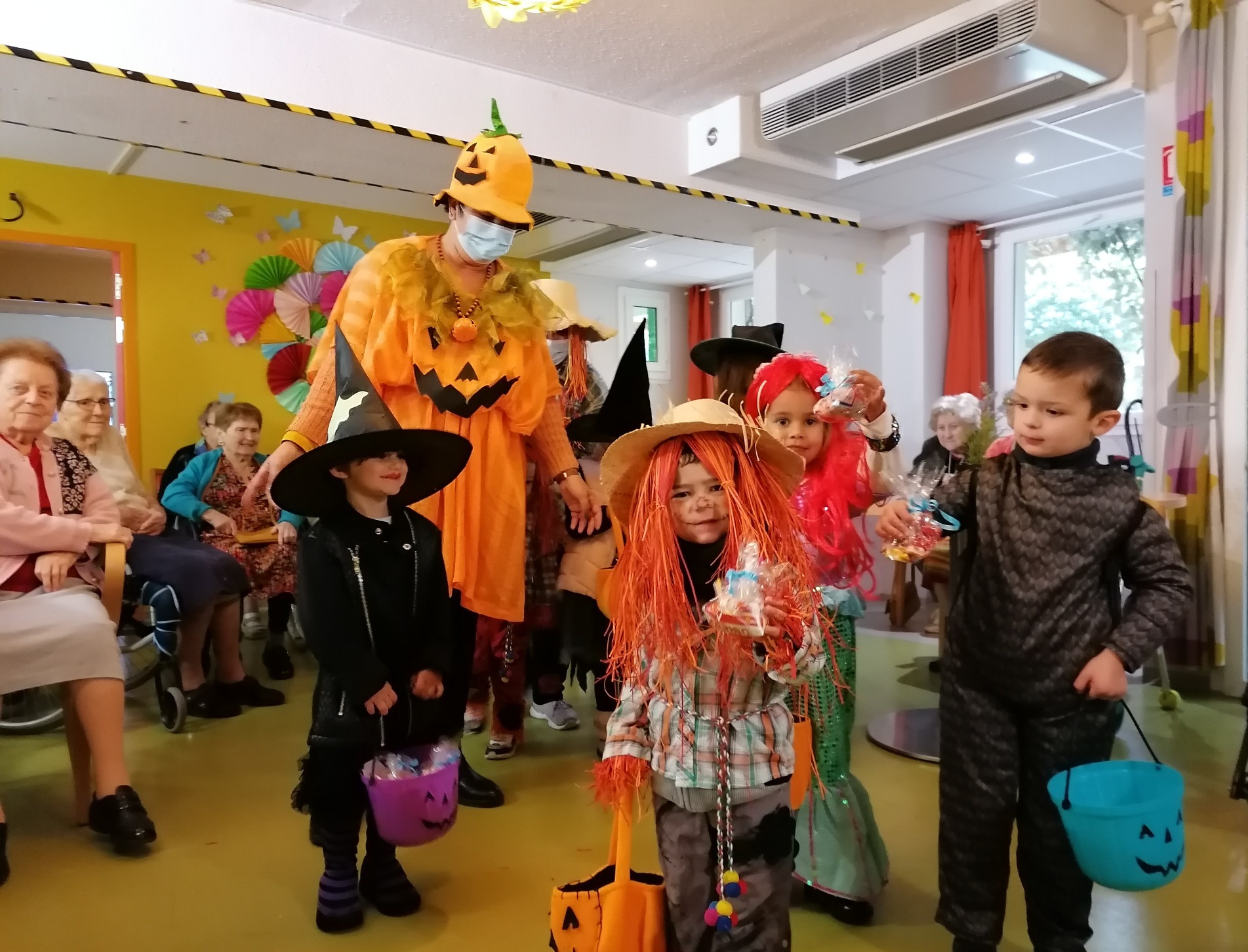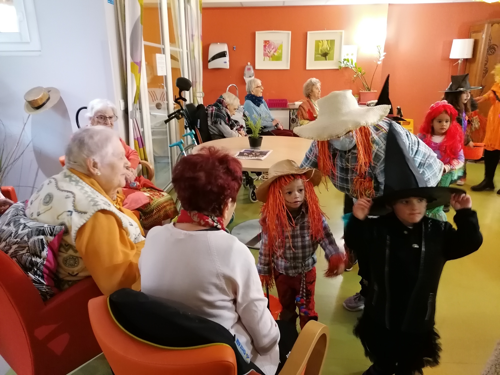 Pour célébrer la fête d’ Halloween, les tous petits accompagnés par leurs assistantes maternelles du village sont venus faire un petit coucou aux résidents. Ils ont défilé déguisés en sorcières, épouvantails, squelettes et monstres effrayants afin de « quémander » des bonbons… Les résidents ont pris un grand plaisir à remplir les paniers des enfants de friandises. Tout ce petit monde s’est promis de se revoir pour les fêtes de fin d’année.