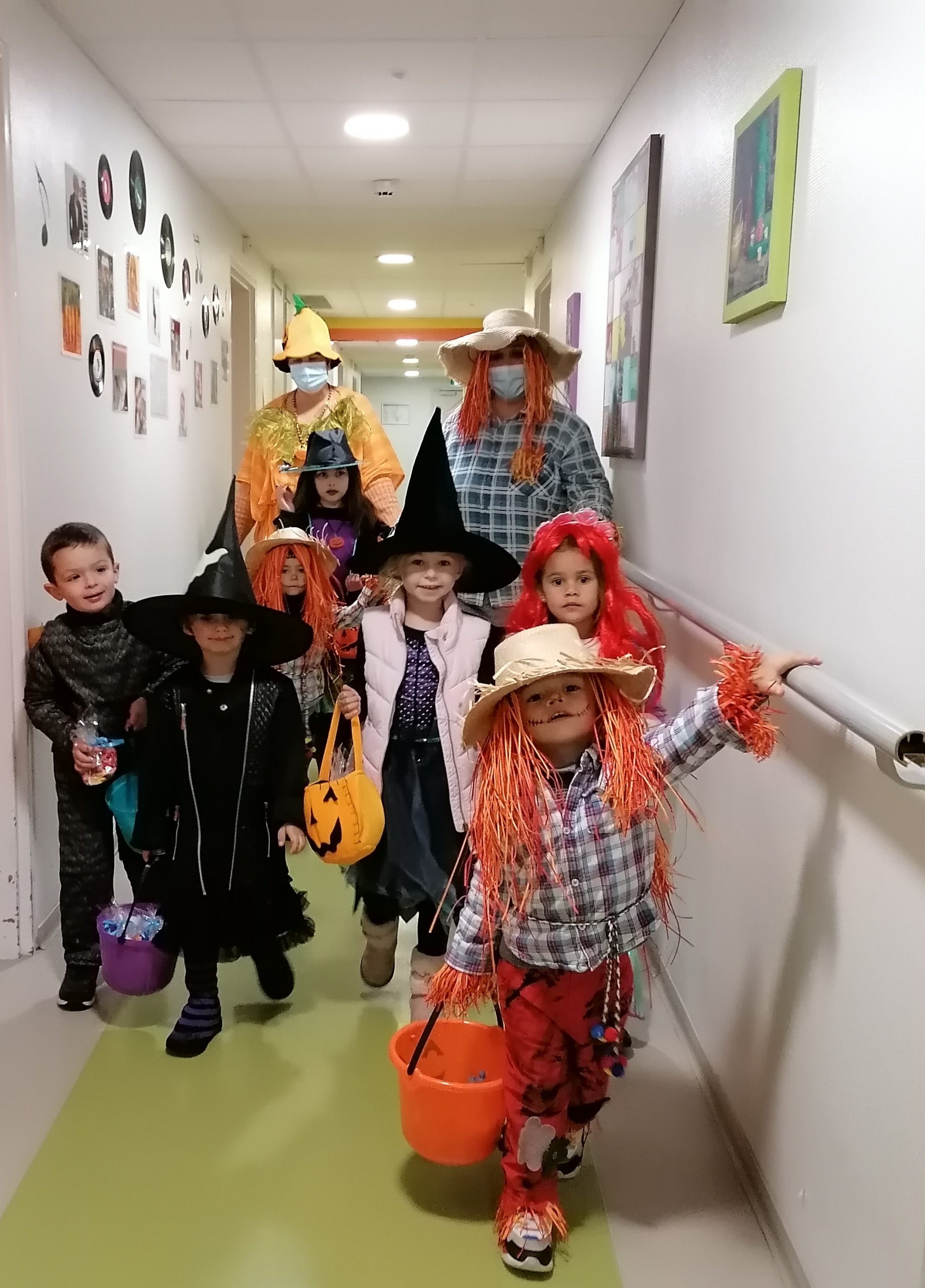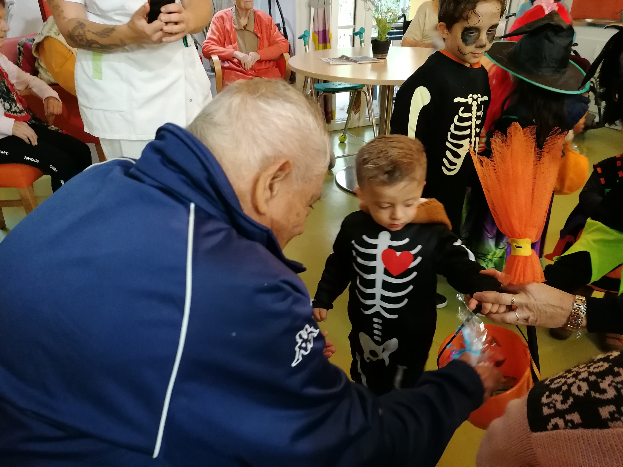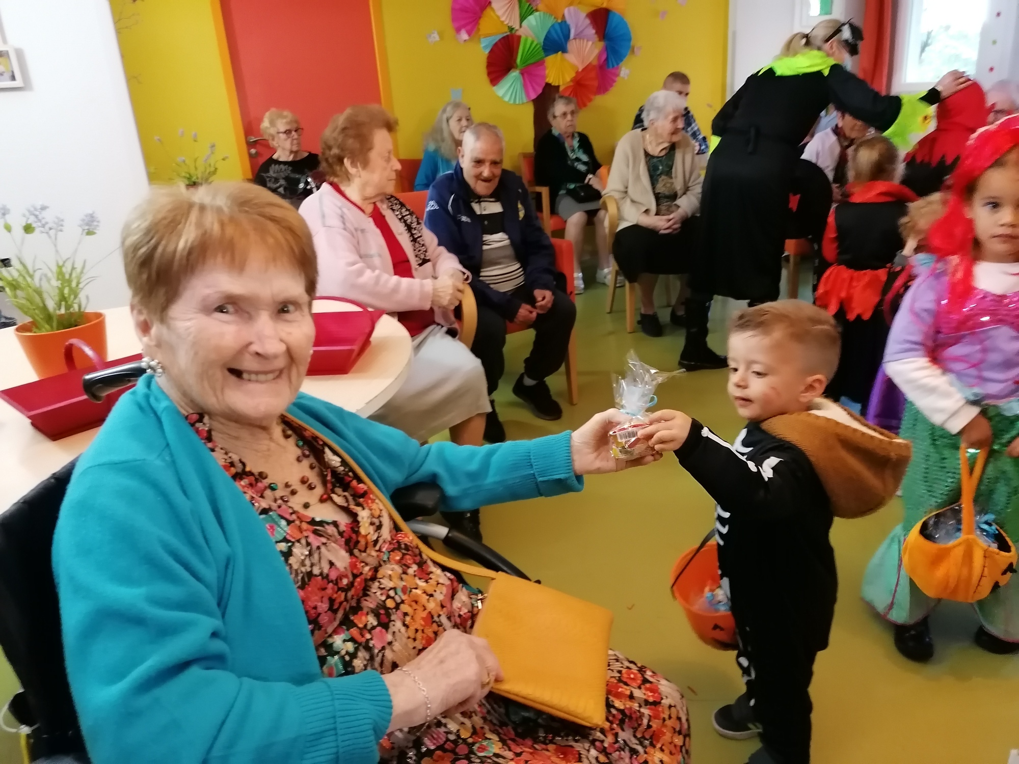 Pour célébrer la fête d’ Halloween, les tous petits accompagnés par leurs assistantes maternelles du village sont venus faire un petit coucou aux résidents. Ils ont défilé déguisés en sorcières, épouvantails, squelettes et monstres effrayants afin de « quémander » des bonbons… Les résidents ont pris un grand plaisir à remplir les paniers des enfants de friandises. Tout ce petit monde s’est promis de se revoir pour les fêtes de fin d’année.