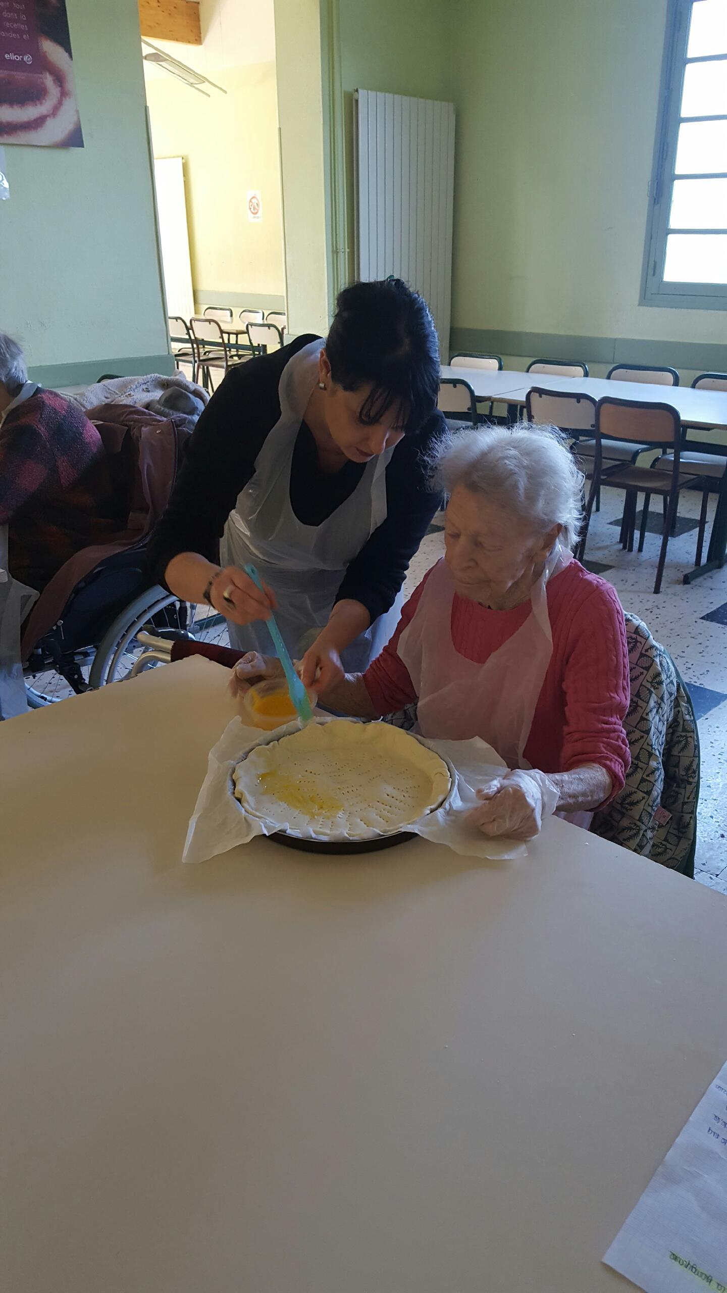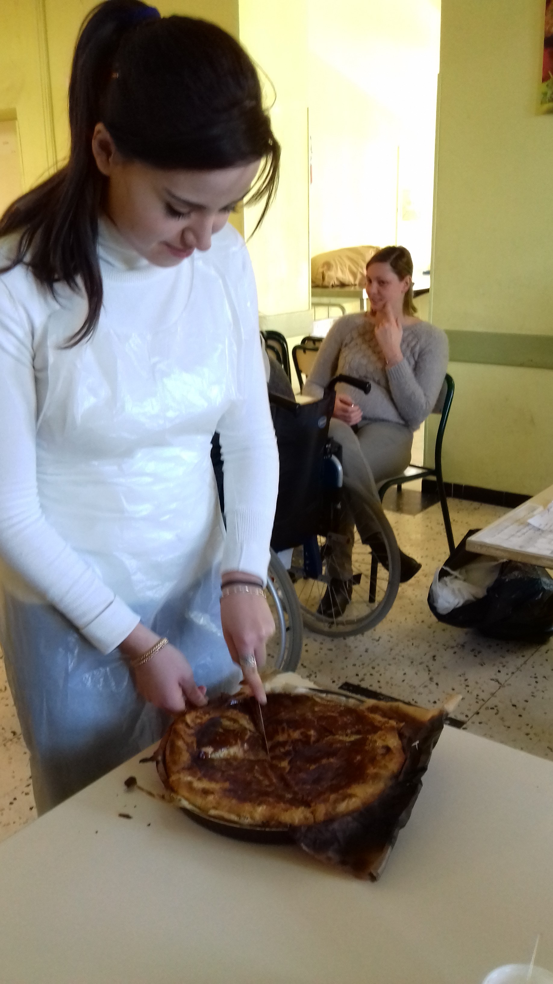 Tout le matériel et les ingrédients étaient préparés, il ne manquait que les « chefs résidentes » en pâtisserie. Le temps de s’équiper et nous voilà en pleine préparation de galettes des rois, une tarte par équipe et en quelques tours de mains les tartes sont prêtes à être enfournées.