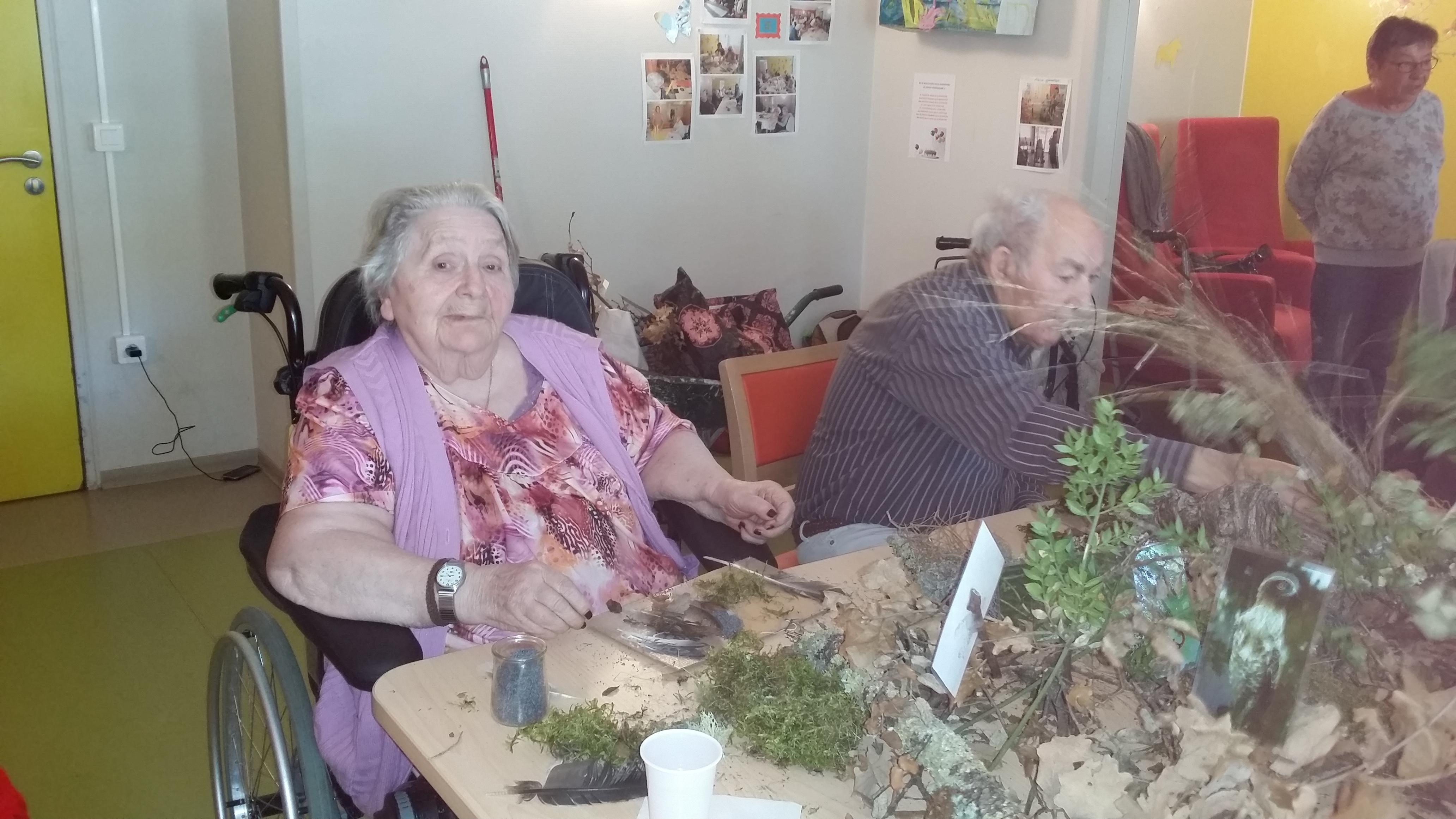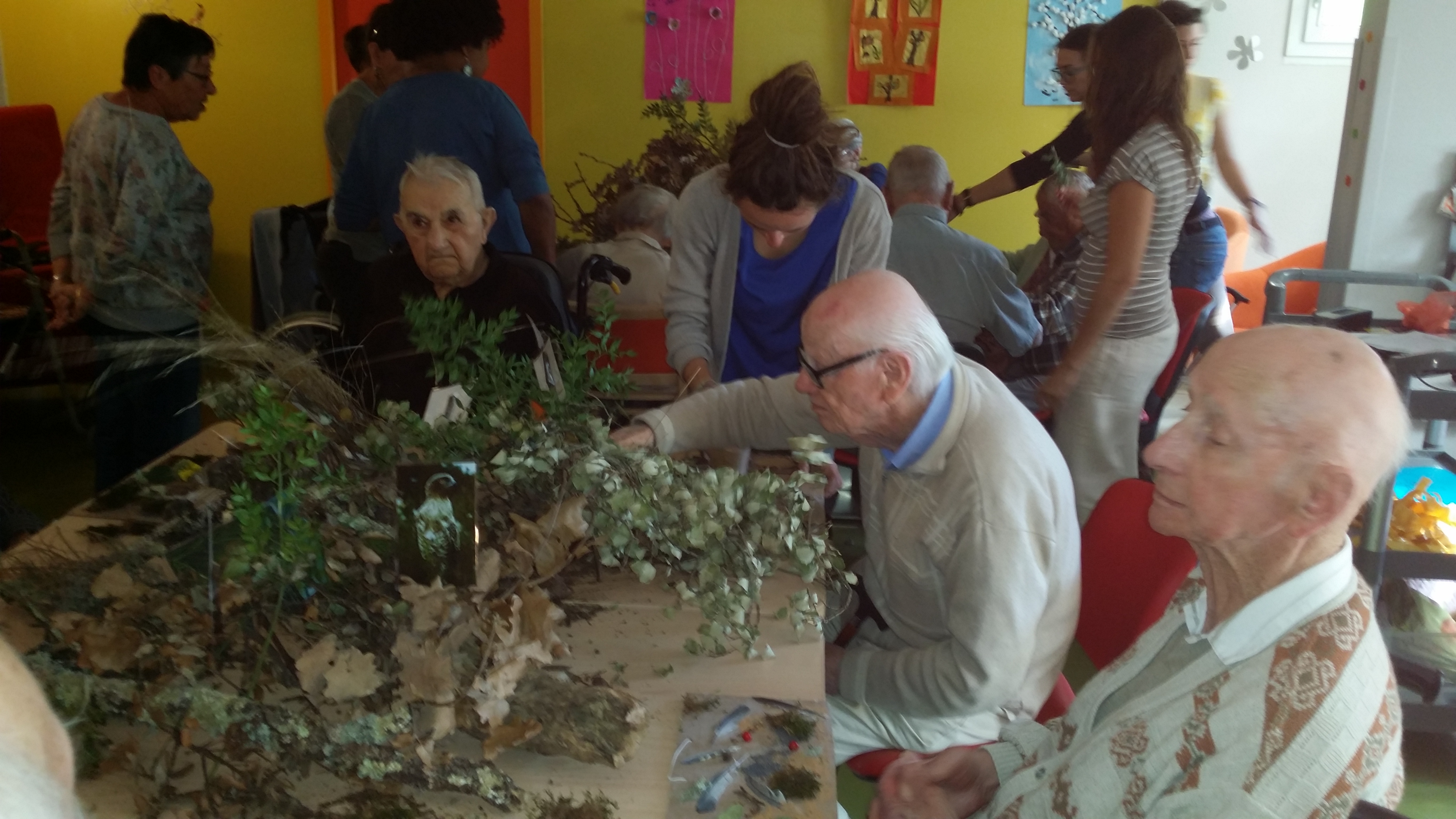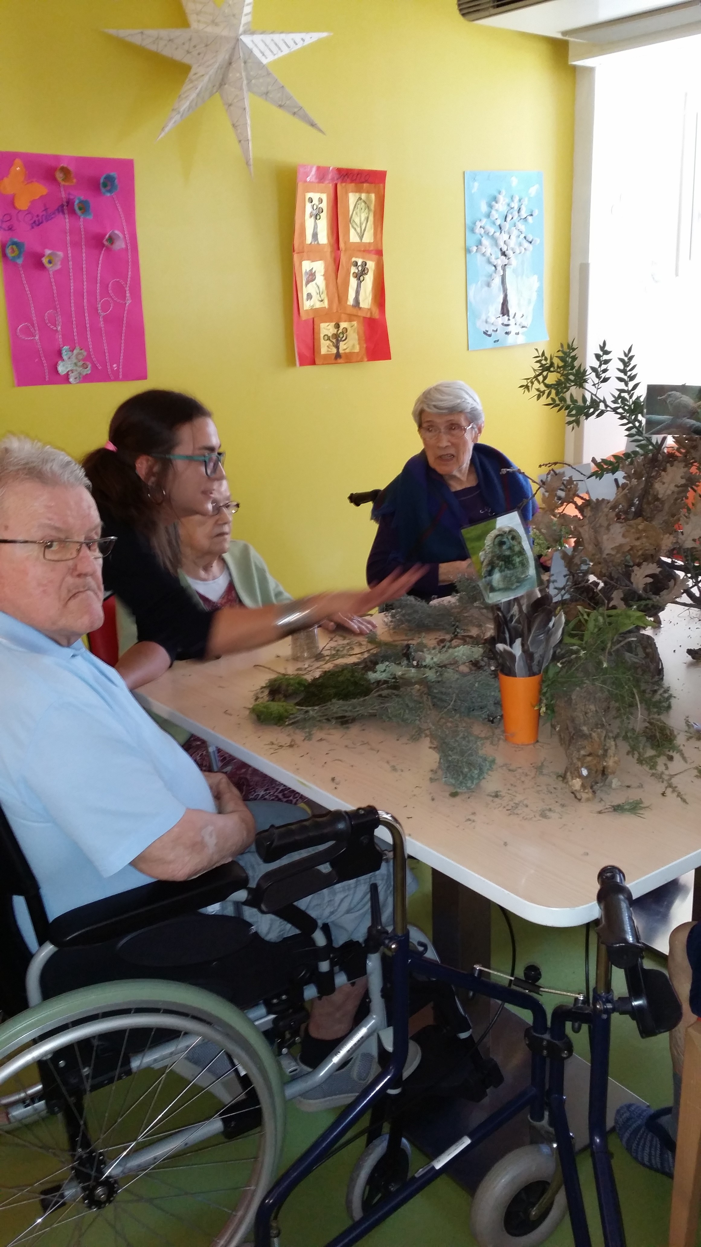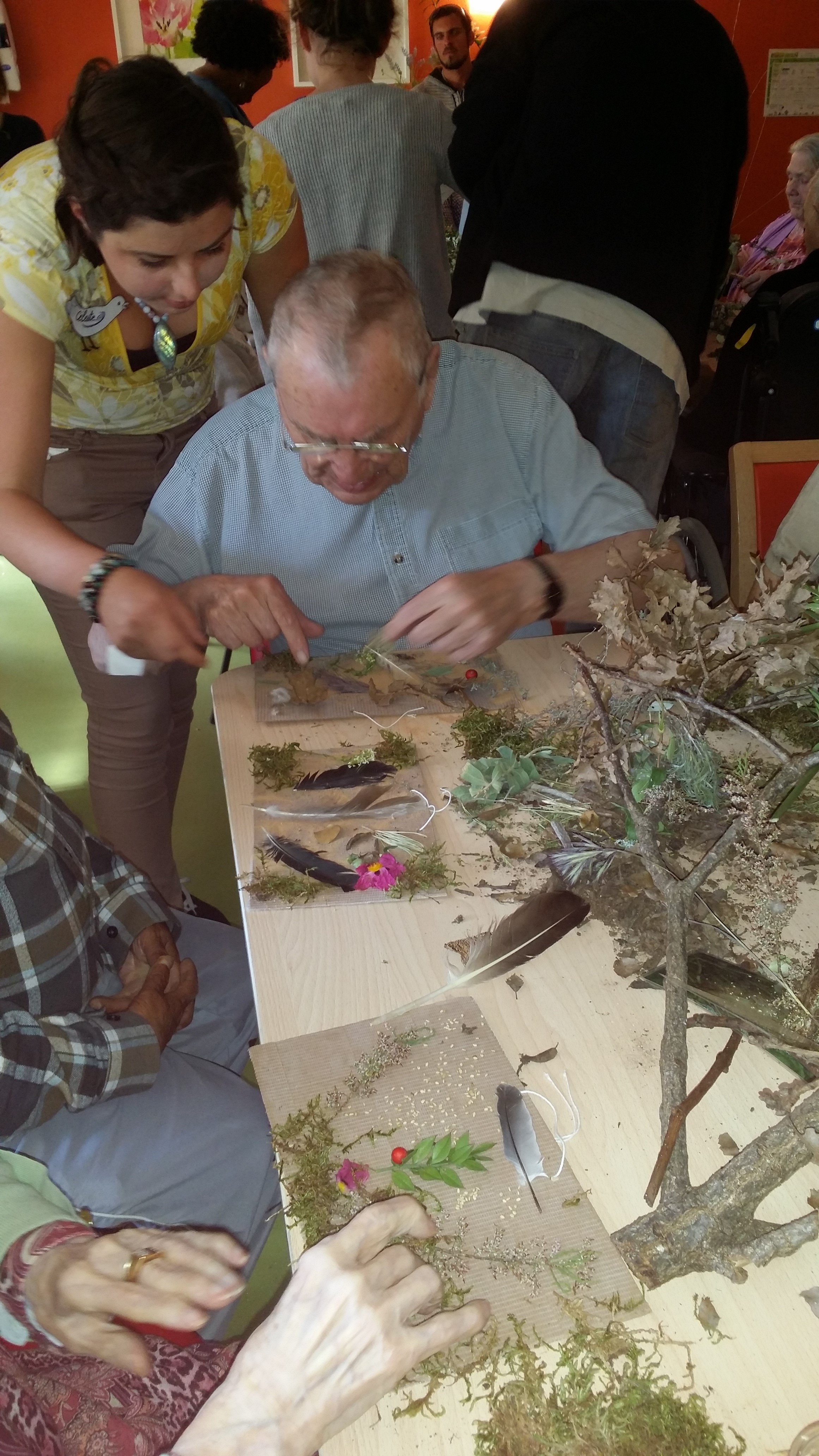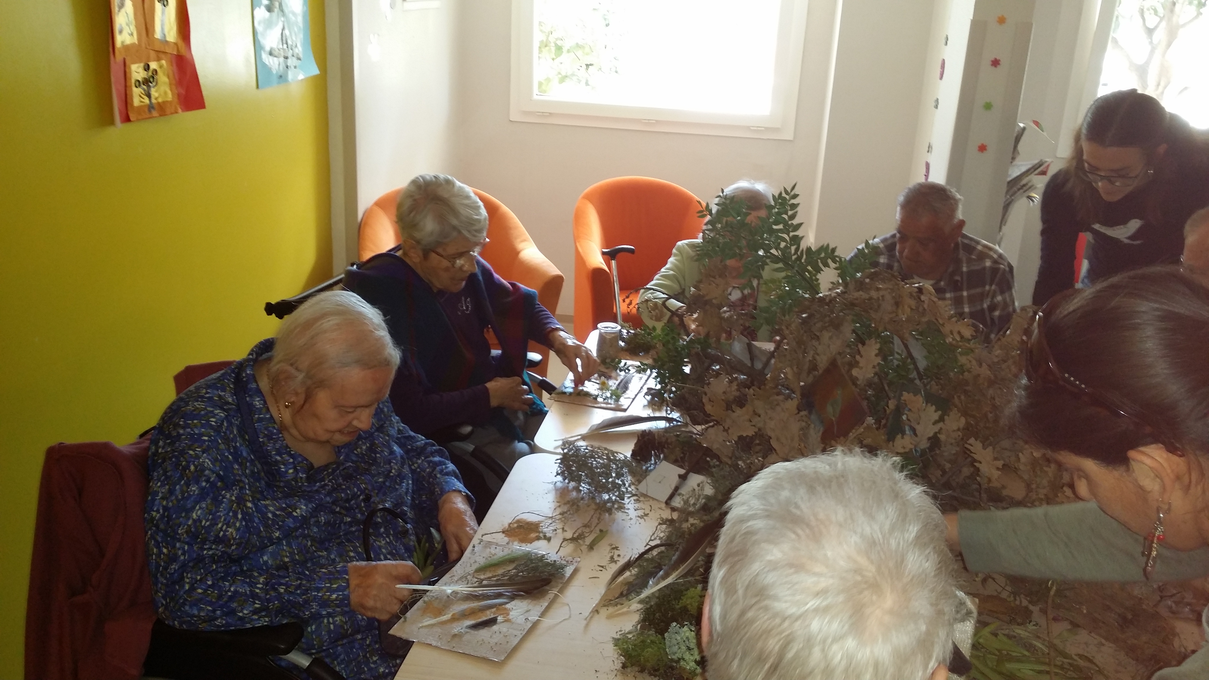 Le toucher : en créant une plaquette en bois décorée par les résidents avec des fleurs, plantes, graines et terre…