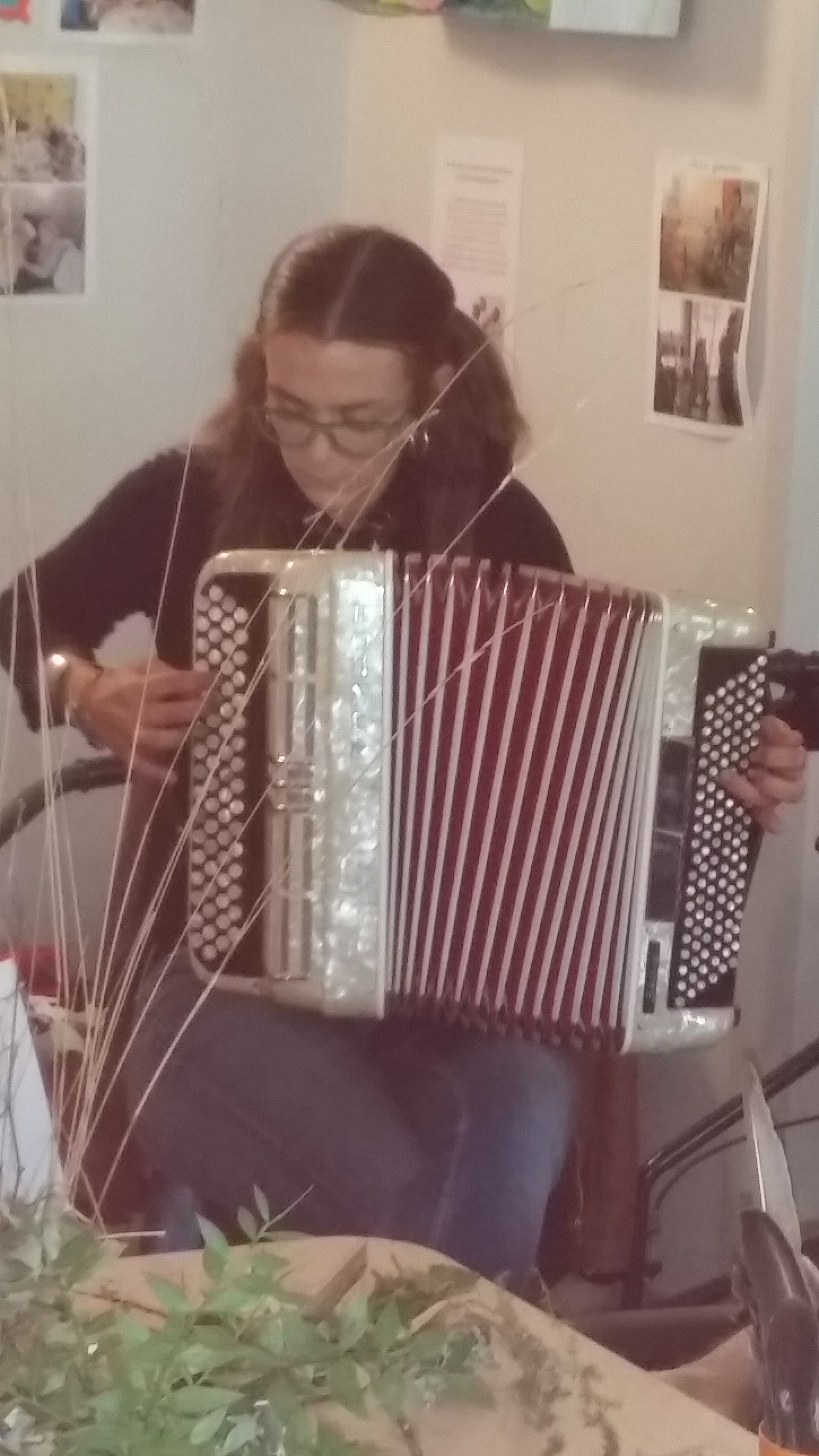 L’atelier très productif (une dizaine de plaquettes en bois décorées) se termine par des morceaux de musique à l’accordéon, interprétés par une des stagiaires BP-JEPS nature.