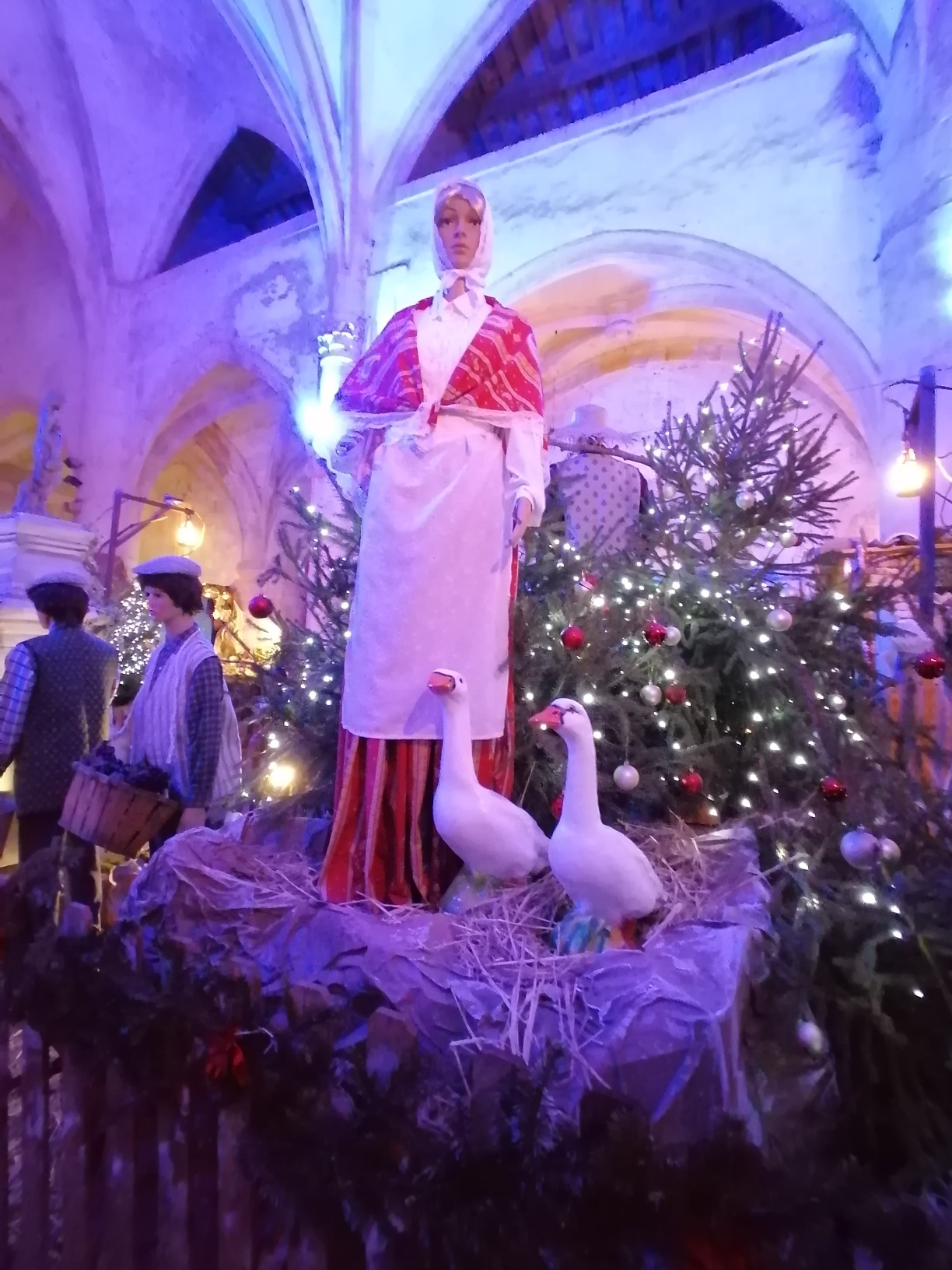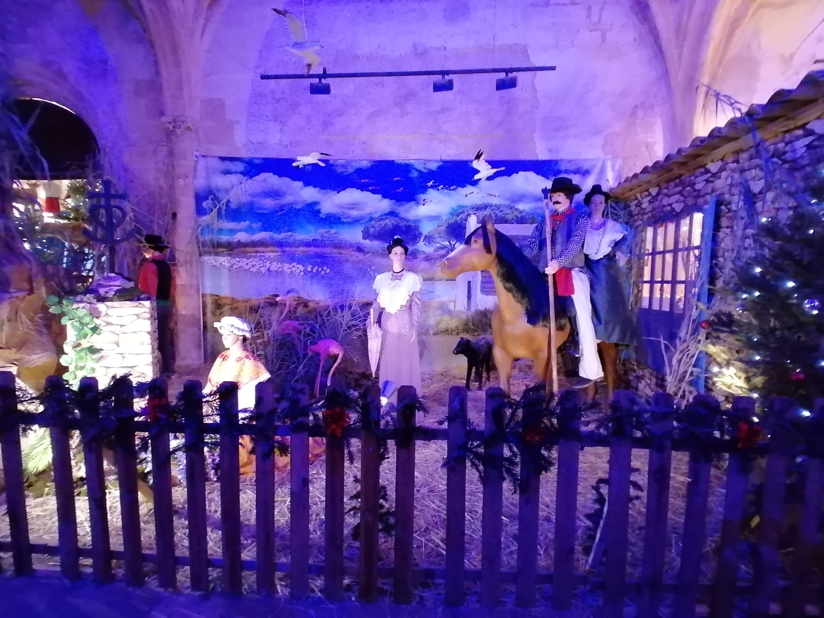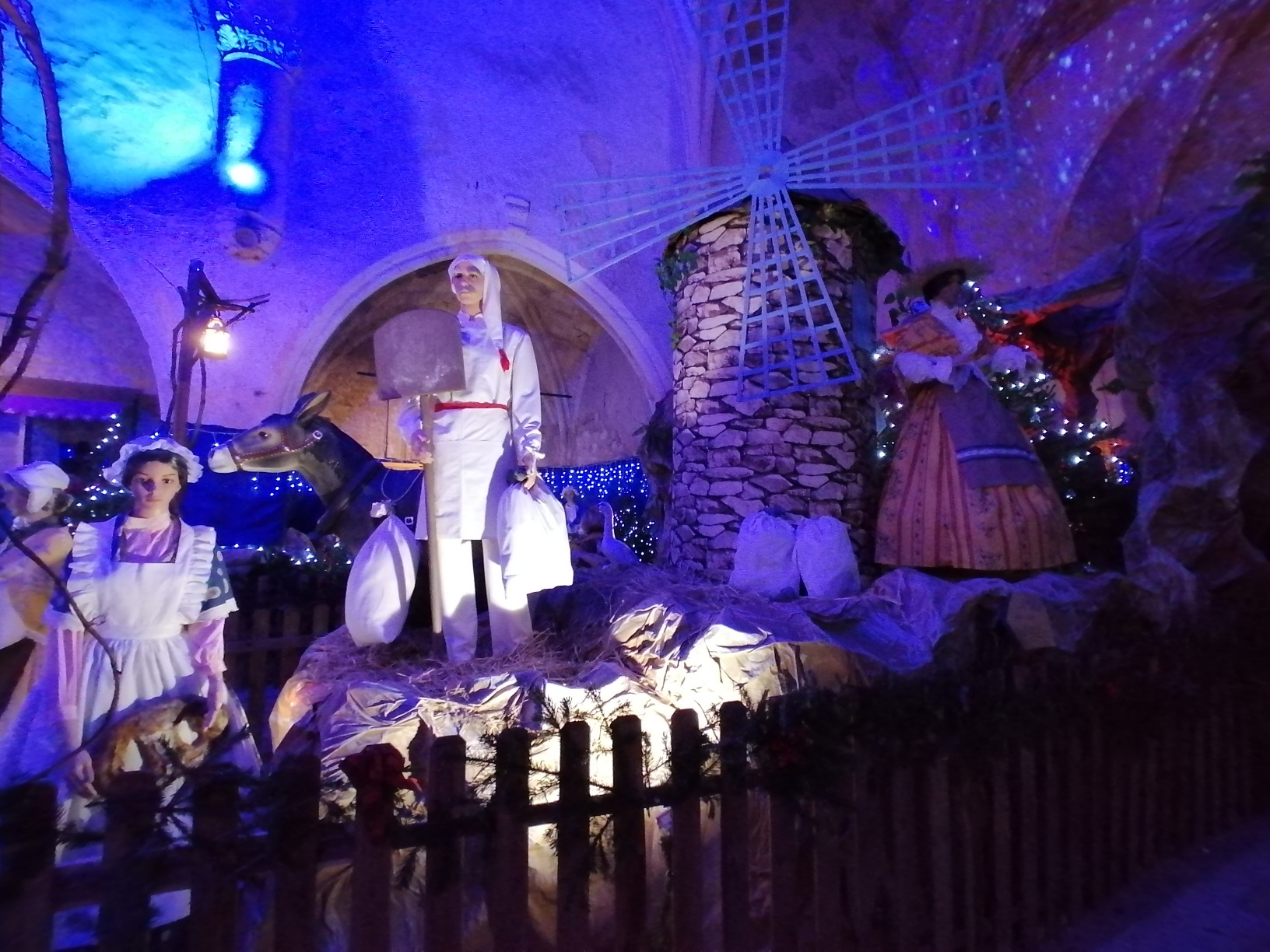 L’ambiance de Noël est toujours présente grâce à la décoration encore en place, sapins et chalets agrémentent le parvis de la chapelle. Nous pénétrons dans le 1er espace à visiter, la chapelle des Pénitents qui se transforme chaque année (la décoration nécessite 4 mois de préparation). On suit un parcours qui représente un mini village avec des santons grandeur nature et des thématiques différentes chaque année. Les métiers d’autrefois, le marché, la garrigue, le campement des Gitans, la place du village, les champs d’oliviers, les vignes, les lavandières, les bergers et leurs troupeaux. Sans oublier l’impressionnante plus grande crèche grandeur nature de France. Puis nous terminons notre visite par le 2ème espace qui se trouve à 2 pas de la chapelle. Ce dernier est consacré au monde enchanté de Noël avec ses décors magnifiques de banquise, pôle nord pour enfin arriver devant la maison de père Noël et son atelier où les lutins fabriquent les jouets. C’est une mise en scène féérique que nous offrent chaque année les bénévoles de cette association, bravo à tous et merci pour la beauté des créations.