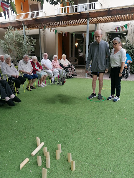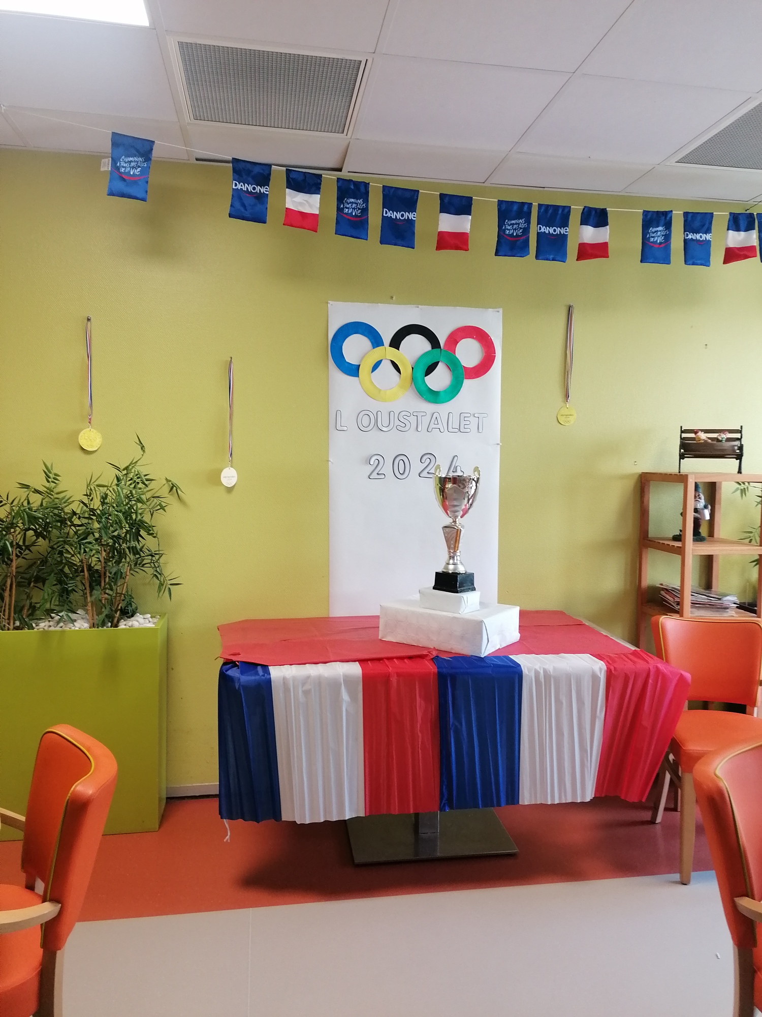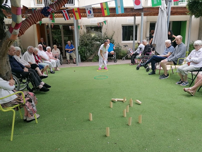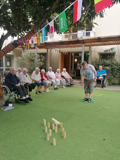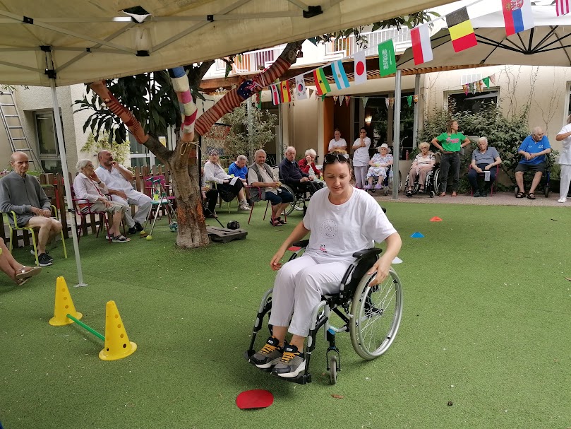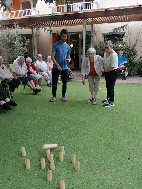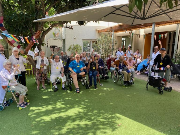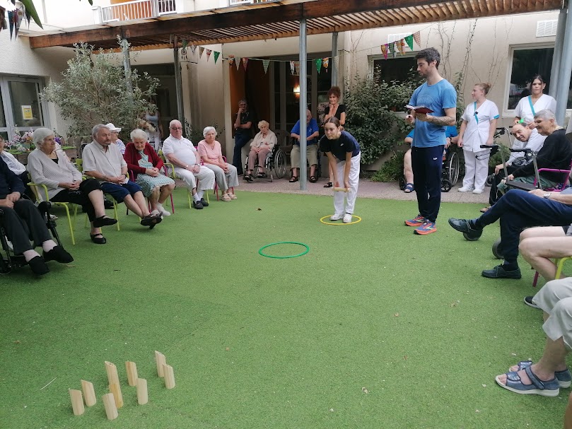 Le lundi 15/07 était prévu une première rencontre Olympiades inter-EHPAD, malheureusement l’EHPAD invité a eu un contretemps. Nous rebondissons en l’organisant en interne et l’ensemble des résidents et salariés y participe sous la houlette d’Alexandre notre prof de sport (APA)